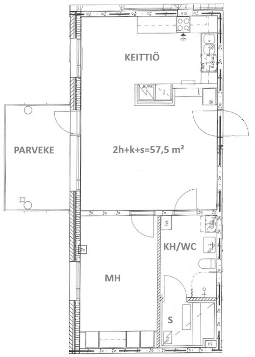 Kerrostalossa 2h+k+s=57,5 m²