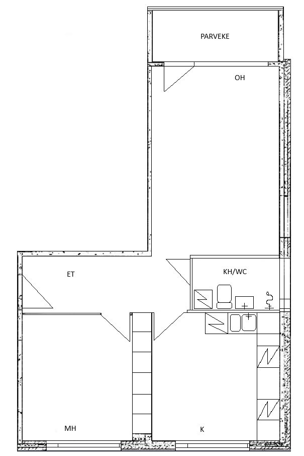 Kerrostalossa 2h+k=57 m²
