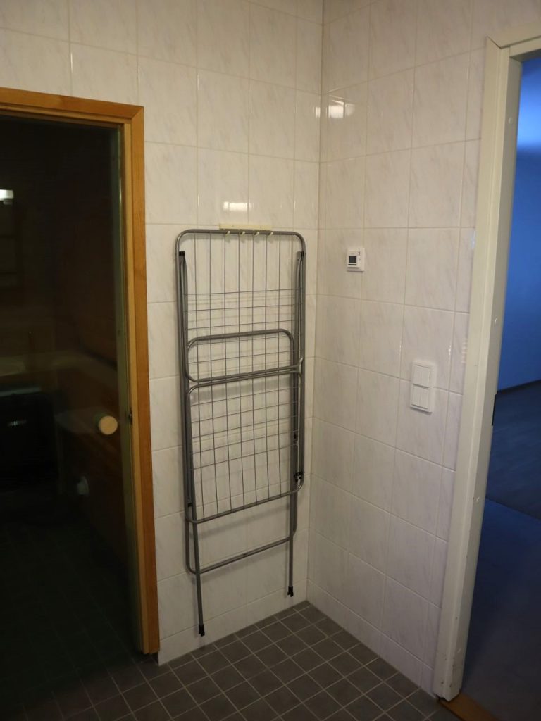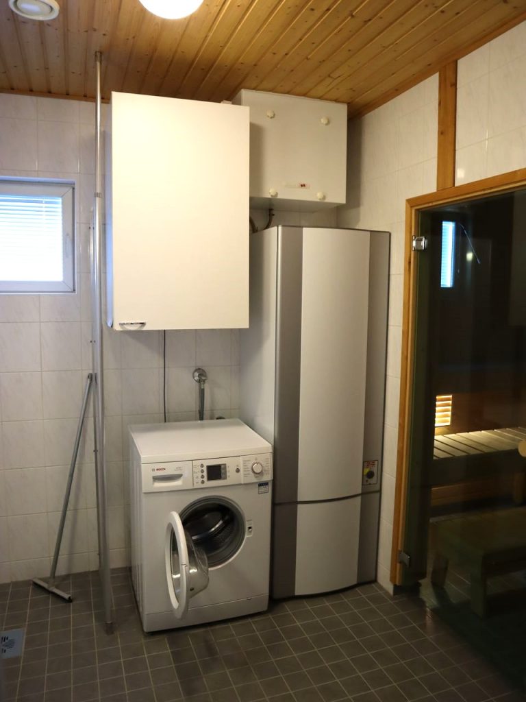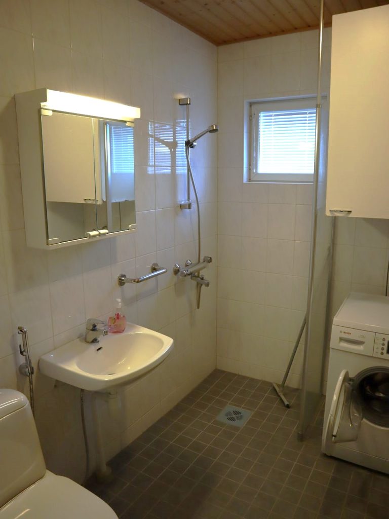 - Kylpyhuoneessa liitäntä pyykkikoneelle, kuvissa näkyvä kone voi jäädä